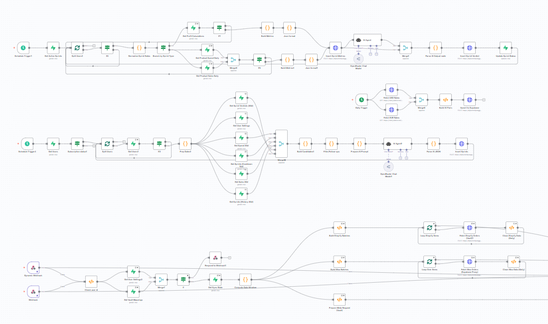 - Ydin: 100+ node n8n workflow synkkaa WooCommerce + Meta → laskee voiton → tallentaa DB:hen